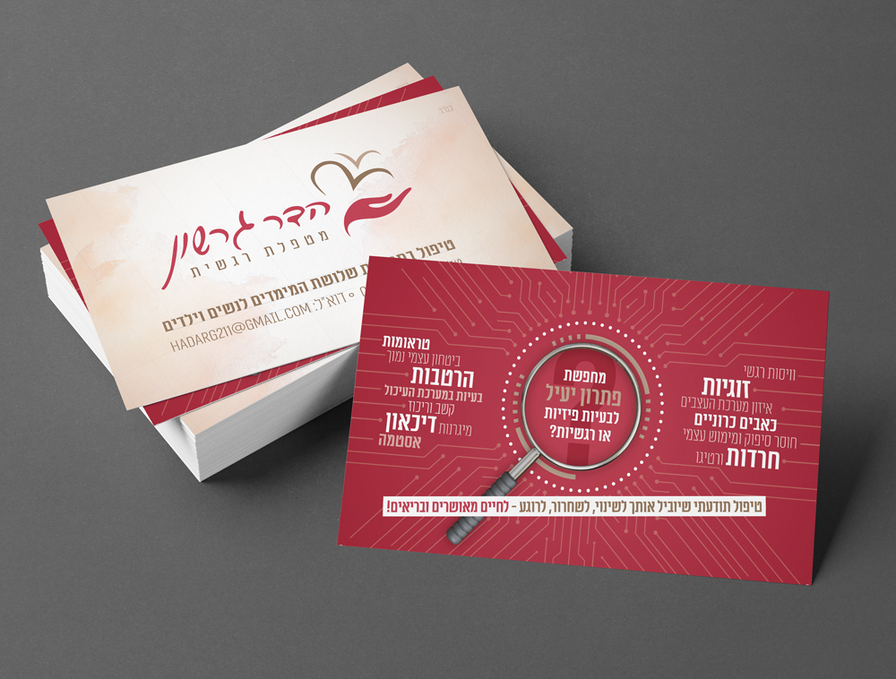 בנוסף עיצבנו כרטיס ביקור שמשלב מיני פרסום על התחומים בהם הדר מטפלת, באמצעות טיפוגרפיה מעניינת הפחתנו את העומס ויצרנו כרטיס מעניין שכיף להתבונן בו.